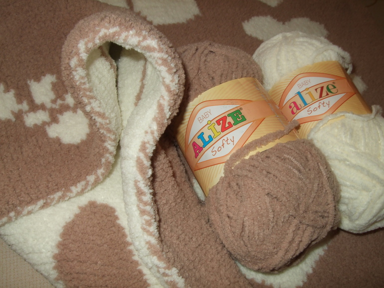 Пряжа, которую я использовала - ALIZE SOFTY. Цвета №62 (молочный) и №617 (кофе с молоком). Спицы №4. Ушло ровно по 6 моточков каждого цвета.