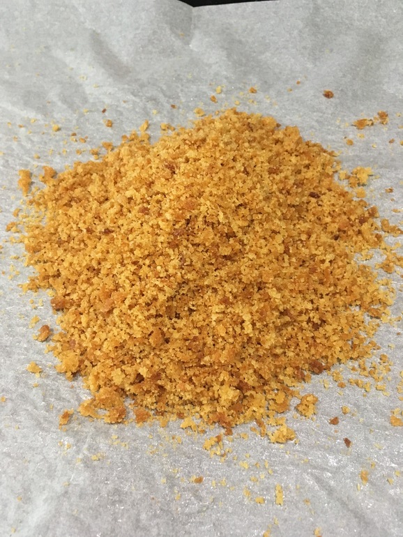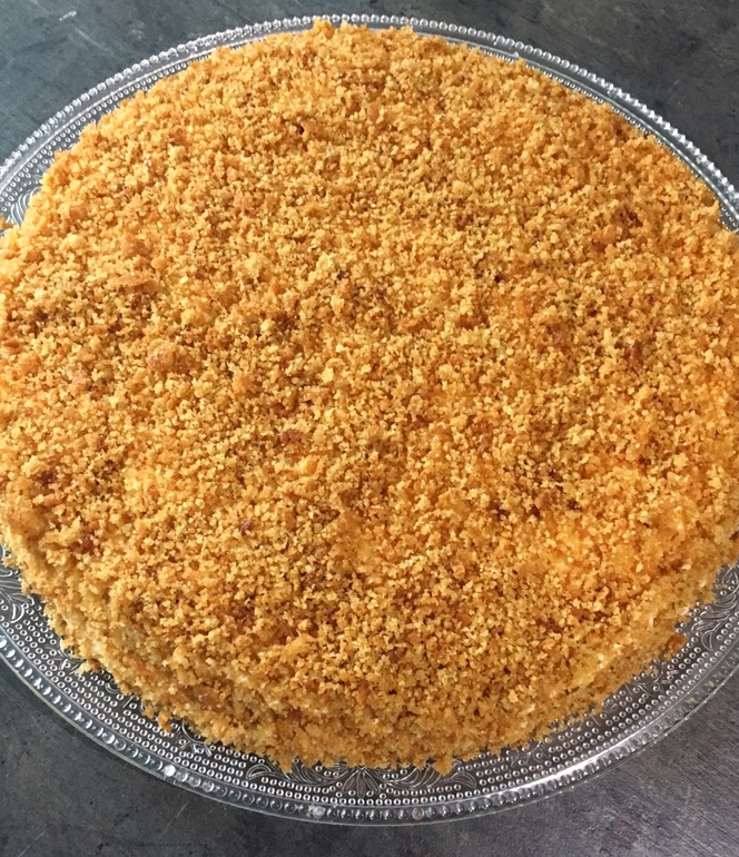 Выпекаем все коржи, и мажем их кремом. Остатками крема хорошо смазать края торта. Последний 6 корж выпекаем и оставляем для украшения медовика. Нужно дать ему остыть и руками перемолоть в мелкую крошку.