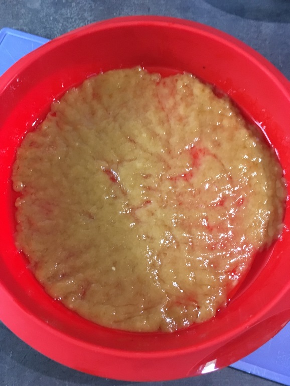 Далее приступаем к выпеканию коржей. Разделяем тесто на 6 частей (я делю на глаз) и выпекаем коржи в силиконовой форме. Выкладываем тесто и разравниваем его руками/пальцами в форме для выпекания. Тесто может начать уползать обратно в центр, поэтому разравнять нужно его как можно скорее и отправить в духовку для запекания.
