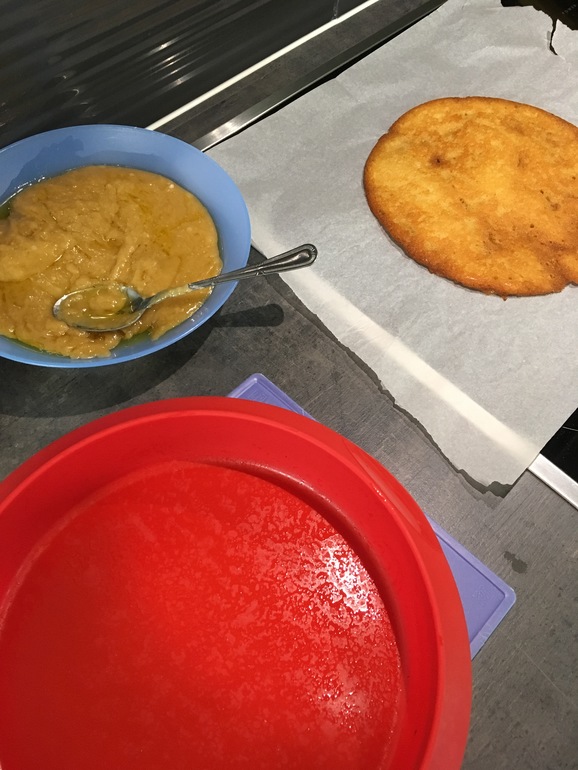 Печется один корж ~3-5минут в зависимости от духовки. Корж должен чуть подняться (за счет соды) и красиво подрумяниться. Вытащив корж из духовки, нужно переложить его на бумагу для выпекания (первый корж можно передожить сразу на тарелку/поднос). Дать ему пару минут остыть, перенести на тарелку и нанести на него наш крем.