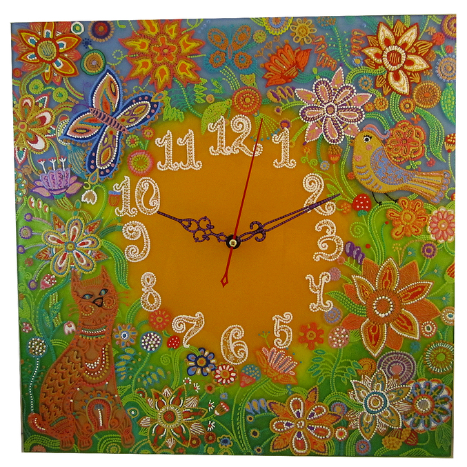 Часы "Цветочная фантазия" сделаны в технике точечной росписи по стеклу толщиной 4 мм и размером 37,5х37,5 см . Часовой механизм "Grand Time" 12-часовой,плавный , бесшумный .