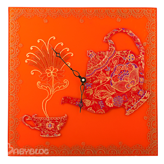 Решила , что у меня нет ничего для кухни и сделала вот такие часики . Чайник и кружку сделала из пластики ,расписала и приклеила к стеклу . Это придало объём работе , ну и я поэкспериментировала с новым для меня материалом .