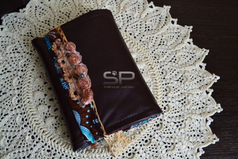 В софтбуке 200 стр., средней плотности, бумага тонирована кофе, на некоторых страницах штампики. Декор выполнен хлопковым кружевом, объемными цветами, деревянными бусинами, чешским стеклом, коконом шелкопряда, ониксом и бисером ТОНО и др. Закрывается софтбук на резиночку. К обложке можно крепить карандаш или ручку.