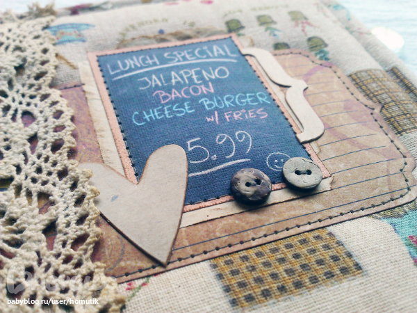 Формат 18*18см, 70 страниц из крафт-бумаги с рваным краем, обложка из микровельвета, цвет «Горький шоколад», на заднем форзаце небольшой кармашек. Закрывается на резинку с рюшей (резинка с запасом). Закладка - кружево. Книга предназначена для вклеивания (можно и записи) рецептов. Будет расти и пухнуть со временем. Для меня в последнее время стало удобнее вклеивать рецепты, а не переписывать))), может кому знакомо))).