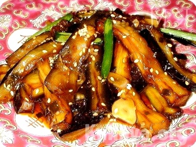 Чистим и режем баклажаны толстенькой соломкой и обжариваем на большом огне 3 мин. Потом заливаем их водой , чтоб вода по крыла на 4 см и тушим на мал. Огне-10 мин. Пока они тушаться делаем соус :1 ст л уксуса, 2 ст л соевого соуса, 1 ст л меда , 1 ст л сахара и 2 ст л крахмала, все хорошо перемешиваем. Затем достаем боклажаны из сковороды а в эту водичку вливаем соус и мешаем, чтоб крахмал был без камочков, потом в этот соус опять выкладываем баклажаны и еще тушим на мал огне 3-4 мин . Все, баклажаны готовы, вынимаем их из сковороды, посыпаем рубленым чесноком и кунжутом и зеленью. Приятного аппетита
