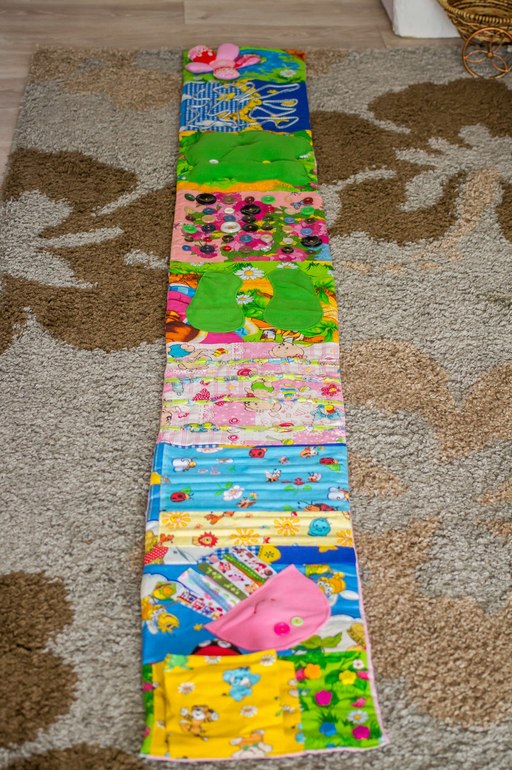 1 блок начинается с цветочка и жучка. Лепестки цветка: шуршат, гремят, с бусинами, мягкие. 2 блок- шнур в виде лабиринта. 3 блок- холмик (внутри синтепон) с цветочками.