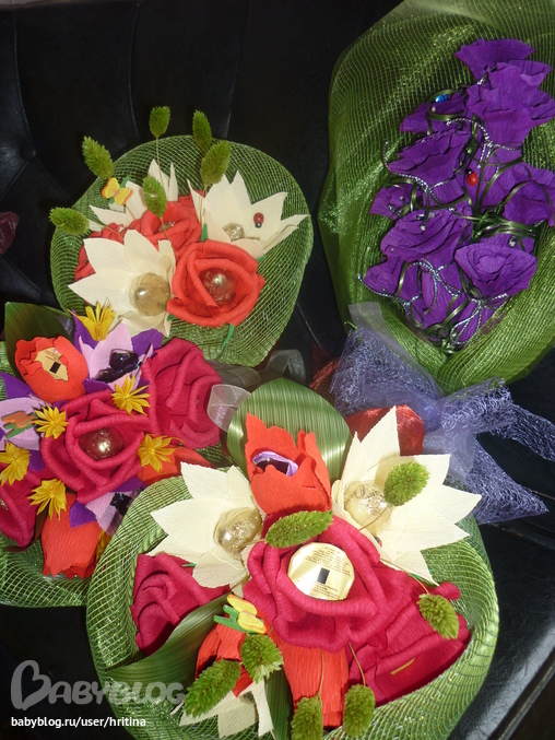 Я если честно в недоумении... Завтра сказала в течение дня букет заберет. Я вот сижу и думаю, может и не надо было денег с нее брать?! Хотя, это мое потраченное личное время, мой материал, который мне в магазине бесплатно не дают, он все ж таки денег стоит... Может нужно было взять с нее только за конфеты?! Конфеты тут дорогие, два сорта конфет по 460 руб., старалась сделать получше... остальные чуть дешевле... Ну как?! Не знаю, расстроилась. Мама говорит больше знакомым не делать, а то наглеют, конфет полкило дорогих, хенд-мейд, и хотят чтобы дешевле было... Наверно она права, не делай добра как говорится...