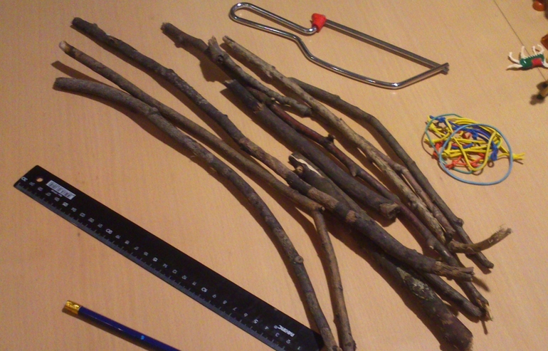 4. К верхним креплениям стоек добавьте еще одну палочку, расположив ее горизонтально. Зафиксируйте положение при помощи резинок или шпагата.