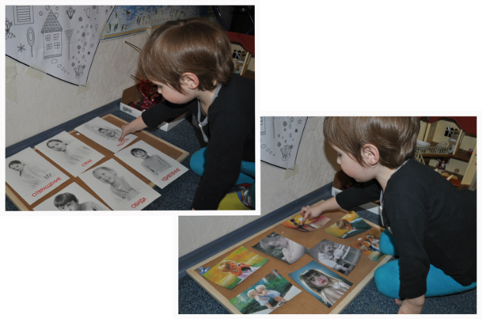 Далее я разложила картинки,которые нашла дома,карточки с эмоциями разные и предложила выбрать Давидке те картинки,на которых люди счастливы,где есть добро,радость,любовь.Затем раскладывала еще карточки,где у одних героев разные эмоции,Давид из этих героев собрал семью.Такой вот стенд получился.(Заодно и разные эмоции повторили,обсудили.)