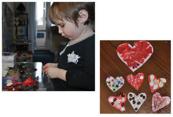 После прогулки решили украсить сердечки,которые мама быстренько вырезала,пока Давид играл с машинами.Дала Давиду пайетки,пуговки,порезанные нитки,дырокольные цветочки(тоже быстренько дыроколила сидела)) и Давид захотел еще зерна кофе,достал сам их.Потом еще бумагу Давидка порвал и из нее тоже сделалаи сердечки.В общем получились вот такие символы любви.
