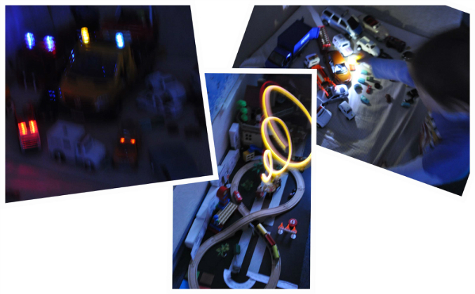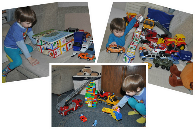 Смотрели,какие тени у разных машинок.Просто Давид играл сам,то дом у него горел,то все в пробках стояли,гараж построили из кубиков..