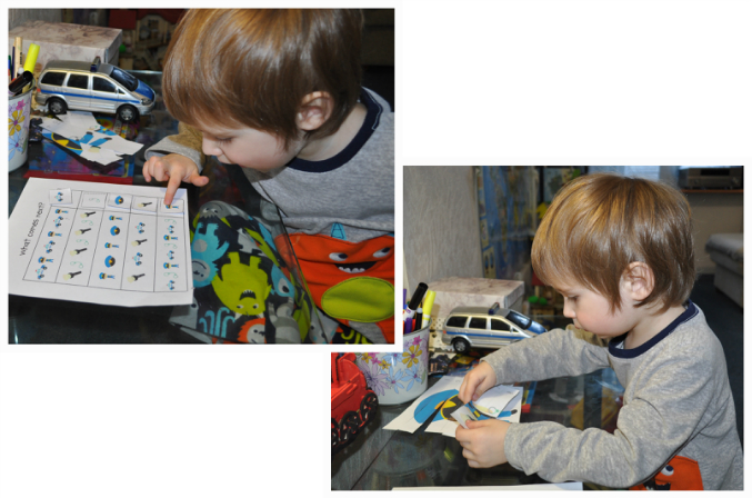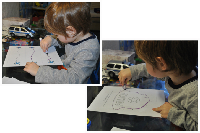 Много времени уделили полиции.Проводилки,пазлы,обвел по точкам полицейский значок,логическую цепочку составляли.Играли в поиски любимой маленькой машинки Сьюзи.Искали ее с фонарями,мигалкими и всеми сиренами,какие есть.(Мы смотрим английские мультики,вот самый любимый про маленькую машинку Сьюзи,оттуда и сама идея похищения и название.)