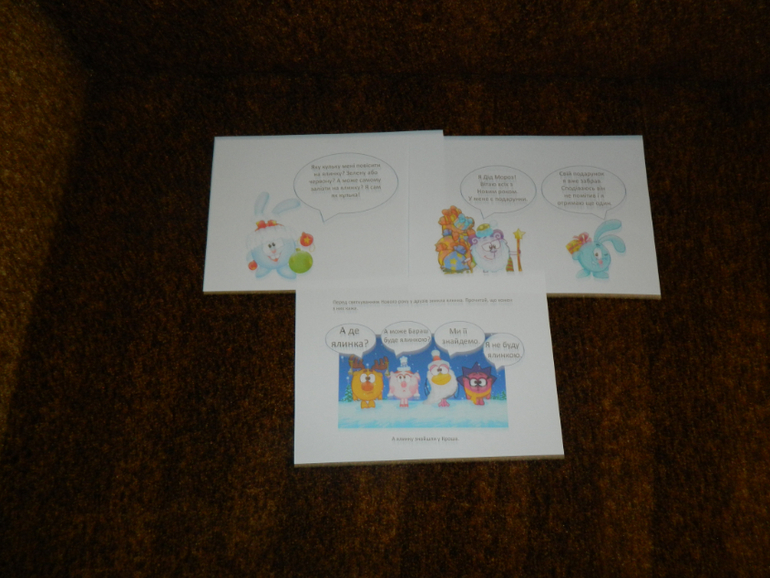 Еще сделала дополнительно 3 страничке для чтения. Просто картинки смешариков новогодних и облачки. В облачки я вставила текст, чтоб Илья прочитал, что они говорят.