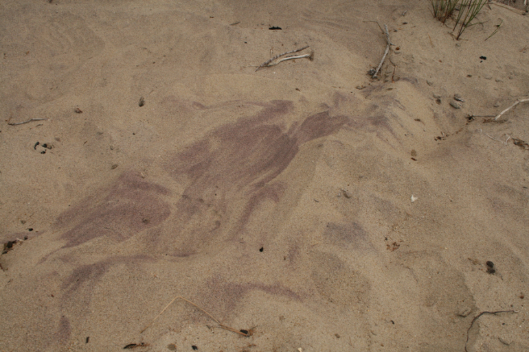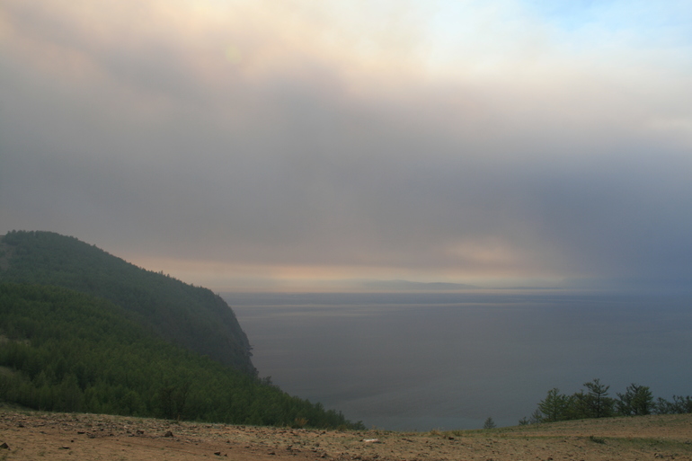 Приехали к берегу, а там разного цвета песок. Мы видели 5 цветов: желтый, белый, фиолетовый, черный и голубой. Все различные минералы. Тем временем солнце скрозь дым стало явственно красным. и уже сильно пахло дымом. Какая перемена! И не скажешь, что утром было ясное небо.