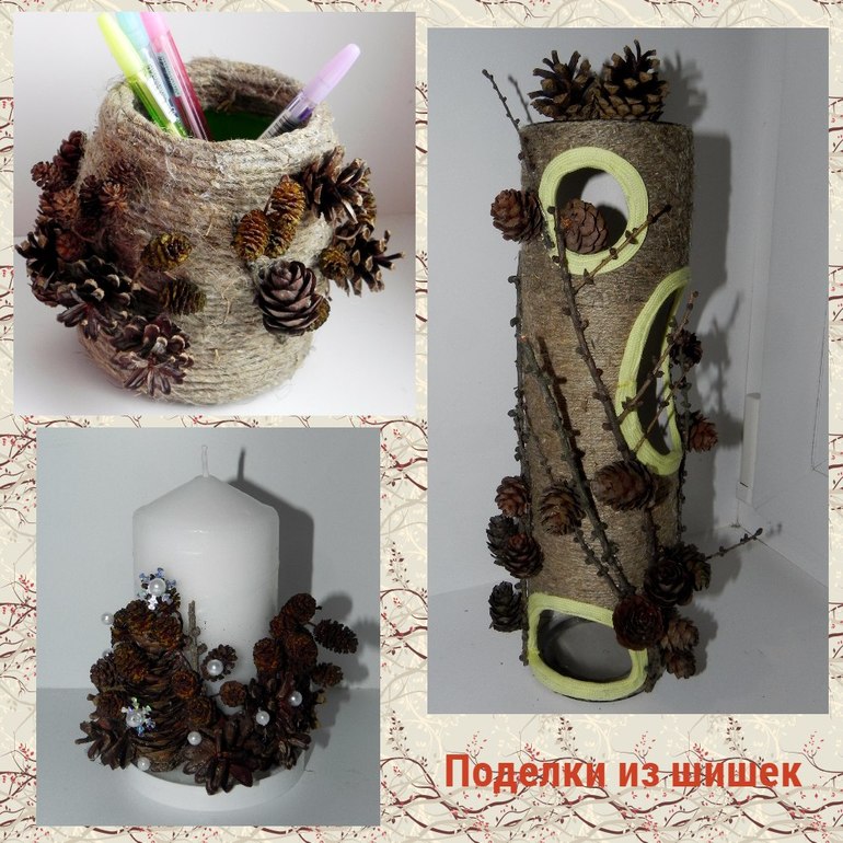 Дорогие мастерицы! В предверии новогодних праздников сотворились у меня рукоделок множество-премножество! Самое моё любимое -декорировать шишками! Шишки собирала сама, в лесу - еловые, сосновые, ольхи и самые лучшие, конечно - шишки лиственницы, которую не так уж легко найти и нарвать! И вот примеры моих работ: бутылки шампанского, бутыли для напитков, чайные домики, магниты на холодильник, свечки..