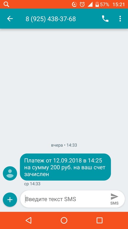 В обед приходим смс с номера!!!)) 8(925)438-37-68 о том, что платеж на сумму 200р. зачислен на мой счет