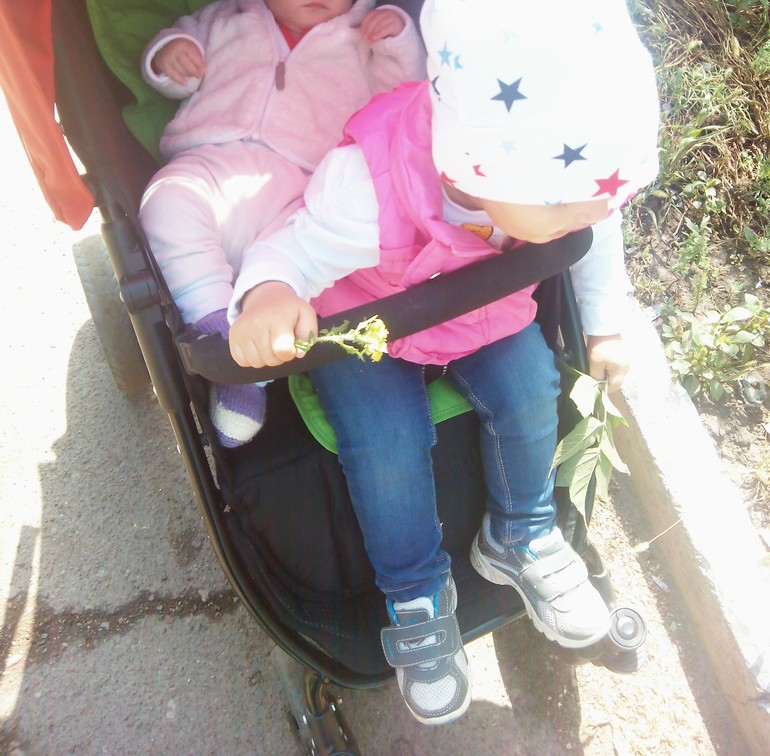 доча вес 12,900, рост 88см. особых изменений нет. знает букву о - говорит и рисует. знает все цвета .считает свои пальчики)) спит днем 3 часа)) убивает нас своей добротой)))хочет мыть посуду, убирает со стола-когда меня нет, и пытается мыть посуду, когда я мою посуду она тут как тут рядом на стульчике стоит и смотрит)) на братика уже внимание не обращает практически,не ревнует,вместе играют))) учится крутить обручь-папа купил детский обручь, чтобы я с ней крутила за компанию)) научилась на телефон фоткать и снимать на видео(((Вот так мы прокатились до поликлиники и обратно. Доча не собирается пешком ходить. Если раньше сын не возмущался когда лиза садилась, теперь орать начинает когда Лизу подсаживаю))) ему тесно уже. Лизу щекотить пальчиками, она хохочет, зато весело! Как в городе погодки передвигаются? Кстати, новая коляска поселилась у нас- снап.