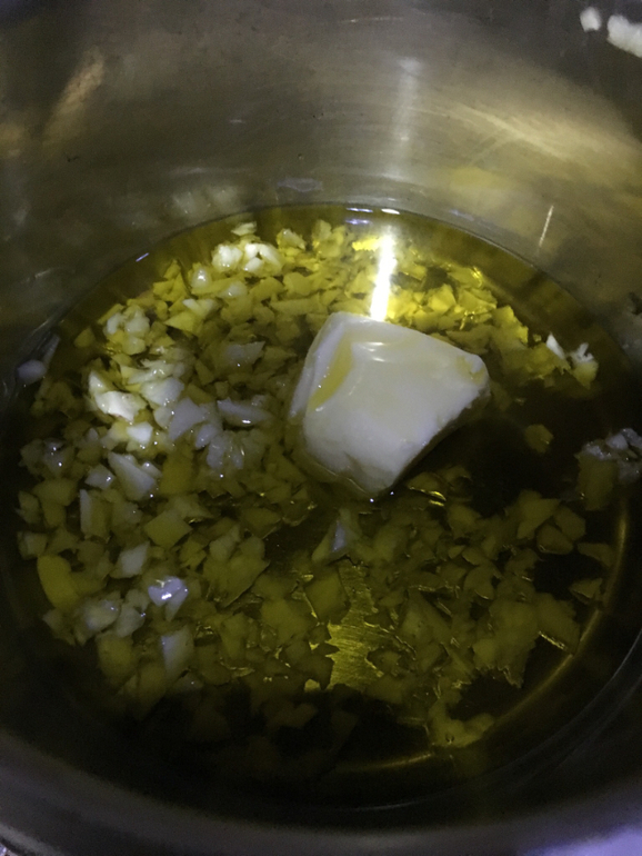 В сотейнике смешать оливковое масло и сливочное. Добавить нарубленный мелко чеснок, и прогреть на самой низкой температуре пару минут