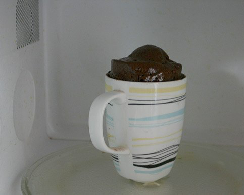 4. Установите микроволновку на максимальную мощность (1000 Ватт) и поставьте наш стакан на 3 минуты. В середине приготовления масса начнет стремительно подниматься над кружкой. Не волнуйтесь, через какое-то время она опустится.