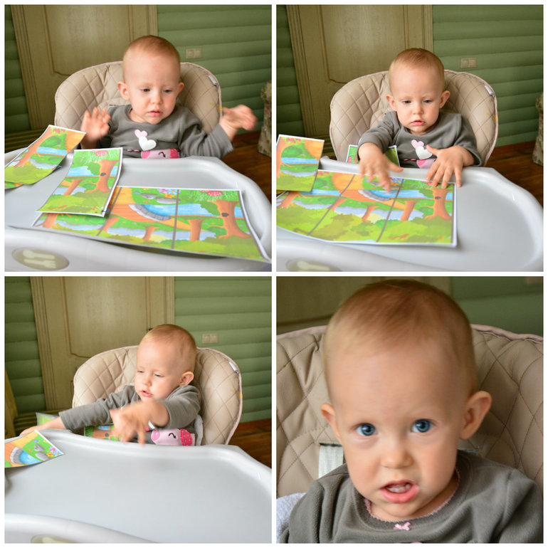 9. Разрезные картинки тоже мимо. Каждое занятие подсовываю их. И каждый раз Ксю совсем не реагирует на них. На этот раз вообще потребовала еды в конце концов и все раскидала.