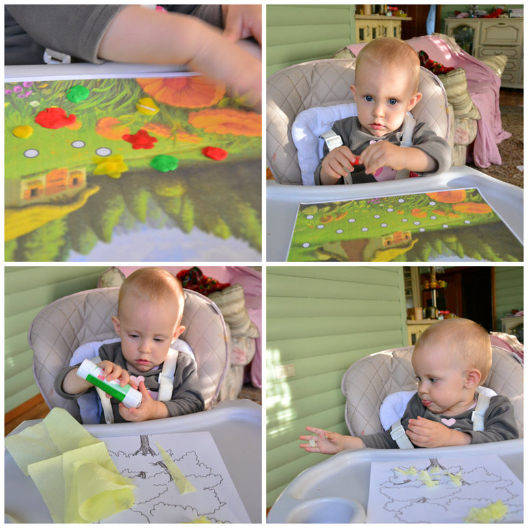 14. Творчество тоже не пошло, ребенок опять хотел есть и спать. Так потыкала, поотклеивала все то, что мама наклеила. Но ничего, у нас еще столько дней впереди:)