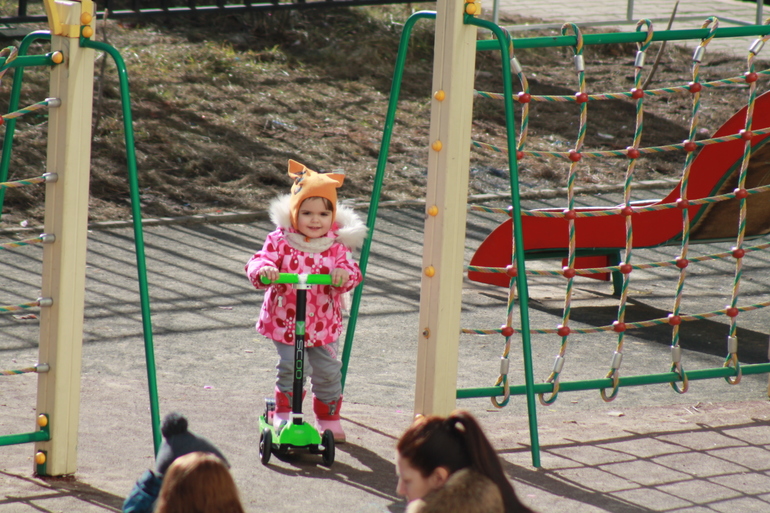 Сегодня первый раз в этом году погуляли с Ладушей на детской площадке по-весеннему. С кучей деток, на солнышке. Очень позитивно. Пришел наш приятель, Егор. Устроили гонки на самокатах. :) Папа из окошка пофоткал. :)