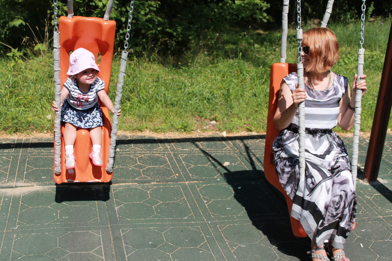 На площадке сейчас хит сезона - качели. Катаемся и поем. Петь Дочка тоже обожает. Особенно песенку котят из мульта "Кошкин Дом". Катаемся и орем-поем "Тетя-тетя-тетя" Вышли на прогулку и не покатались - день прошел зря. )))