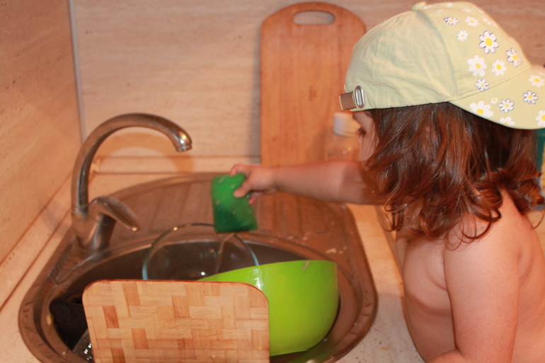 Стоило маме выйти из кухни на пару минут и вот, пожалуйста, помощница тут как тут. Захожу - Ладуша уже посуду моет. Голышом.