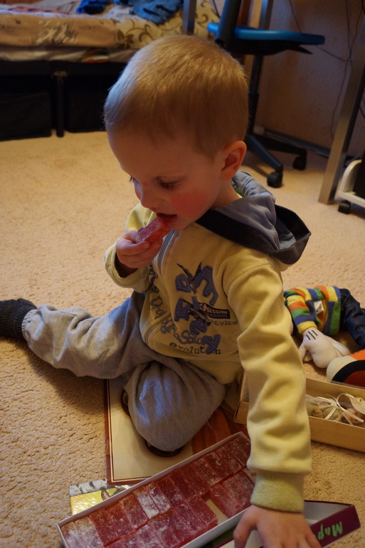 В посылочке лежал очень вкусный, натуральный мармелад архангельского производства. Максим сразу же полез пробовать!