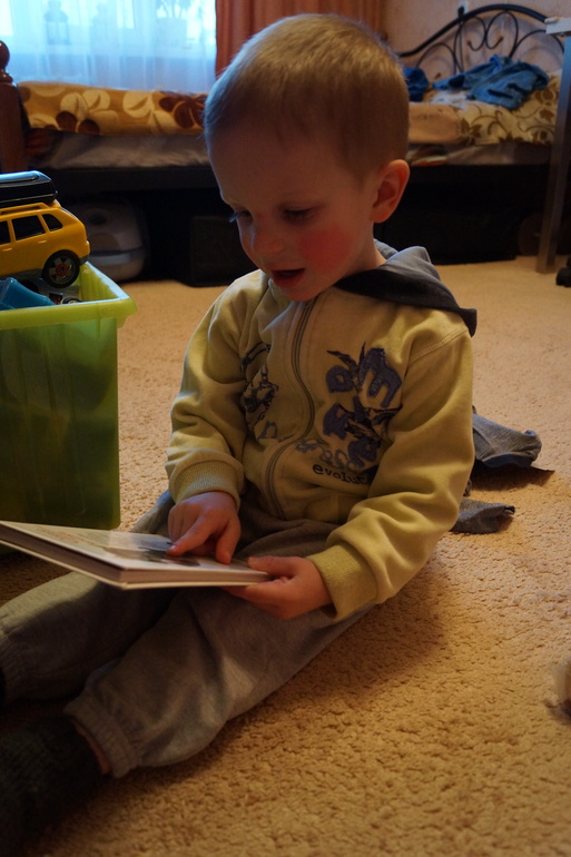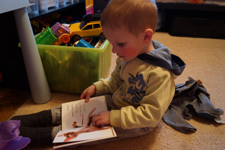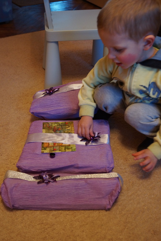 Макс пытается открыть своими силами. Щеки краснющие от мороза. Только что пришли и сразу за сверточки. Не утерпеть ни сыну, ни маме!