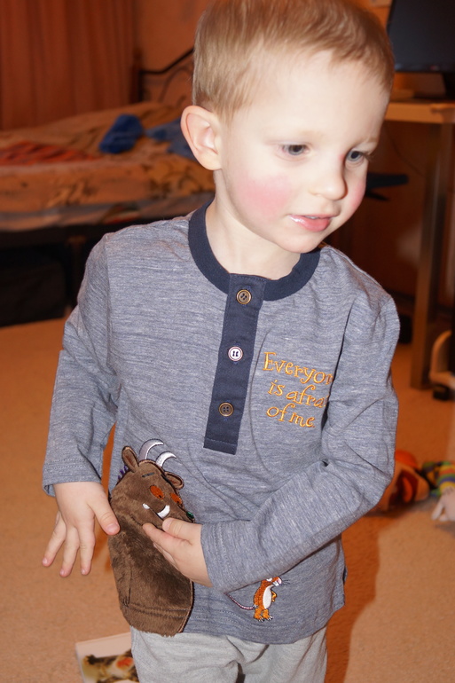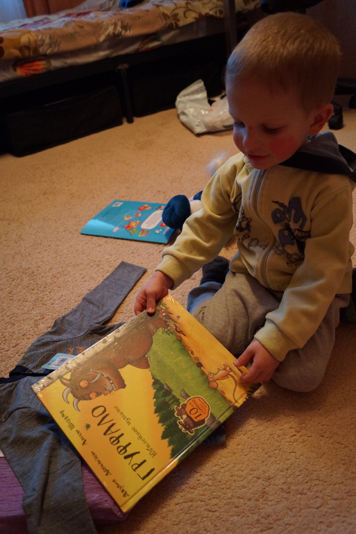 Опять Груффало! Чудесная кофточка, Максу как раз! Удивлен. Долго разглядывал книжку и кофточку, сравнивал, потом разрешил померить ему. Собирался есть в ней суп, еле отговорила, все-таки едим мы еще не очень аккуратно)