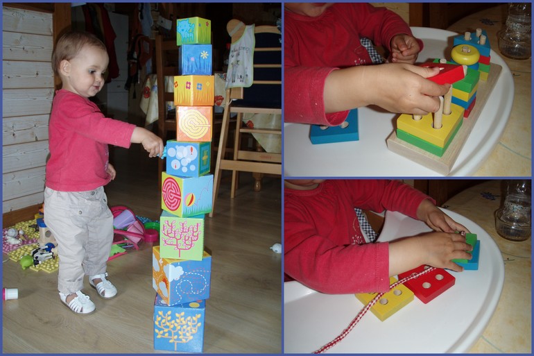 Пытались делать шнуровку, но пока не очень идет. Потом просто занимались сортером, он нам пригодится и для следующих фигур. Строили башню из кубиков. Вернее мама строила, а дочка в это время занималась чем-то своим, зато потом расселяла животных по домикам-кубикам.