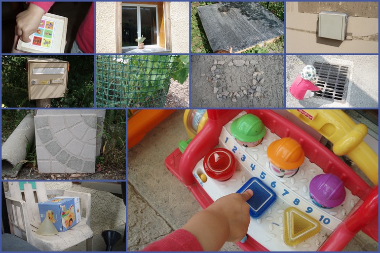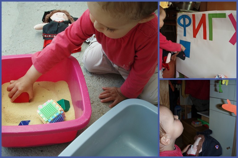 Затем занялись сенсорной коробочкой. Играем мы в нее уже несколько дней, до этого все никак не решалась сделать. Но сейчас летом выставляю на улицу и никаких проблем. :) Сначала пыталась обратить дочкино внимание на содержимое коробочки, чтобы она рассмотрела разные квадраты-кубы. Но она предпочла заниматься пересыпанием крупы, я ей не стала мешать.