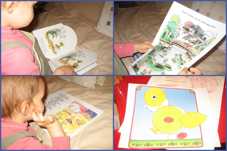 Затем перешли к утятам и цыплятам. Посмотрели книжку Сутеева. Читаем мы ее регулярно, но дочка, по-моему, еще не до конца понимает смысл рассказа. Но с персонажами мы хорошо знакомы. Посчитали цыплят, поискали утят. Затем сделали аппликацию цыпленка. В аппликациях Эмили сейчас проявляет больше самостоятельности, поэтому животные у нас получаются забавные.
