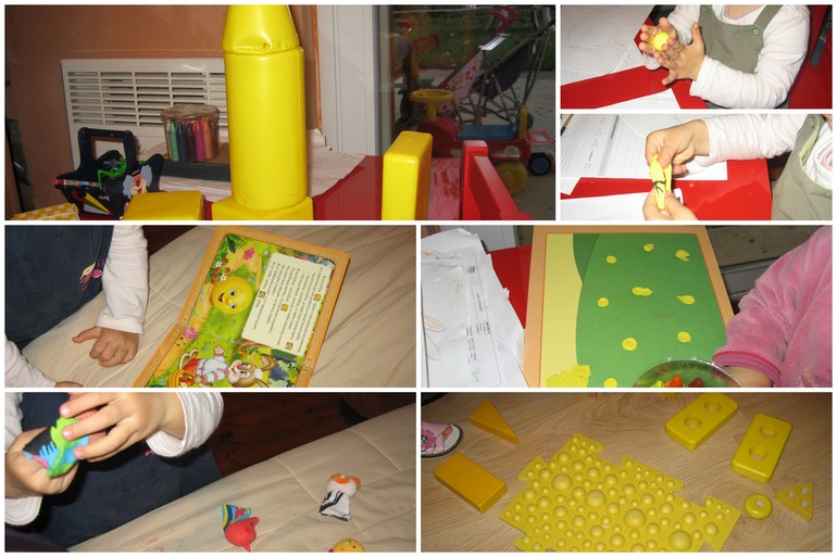 Итак, начали с того, что собрали все предметы, что нашли желтого цвета, внимательно их рассмотрели, стоили пирамиды и ломали их.