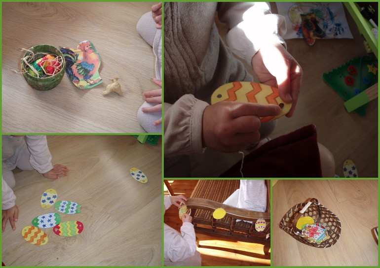 Искали яйца, спрятанные по квартире, складывали в корзинку, это одно из смых любимых занятий.