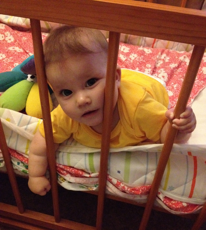 - учится стоять. Пока получается вставать на коленки и на выпрямленные ноги, с упором руками на подушку/маму/кроватку, в общем, какая опора попадется. Ножки еще конечно не окрепли, так что получается недолго. Но очень старается!