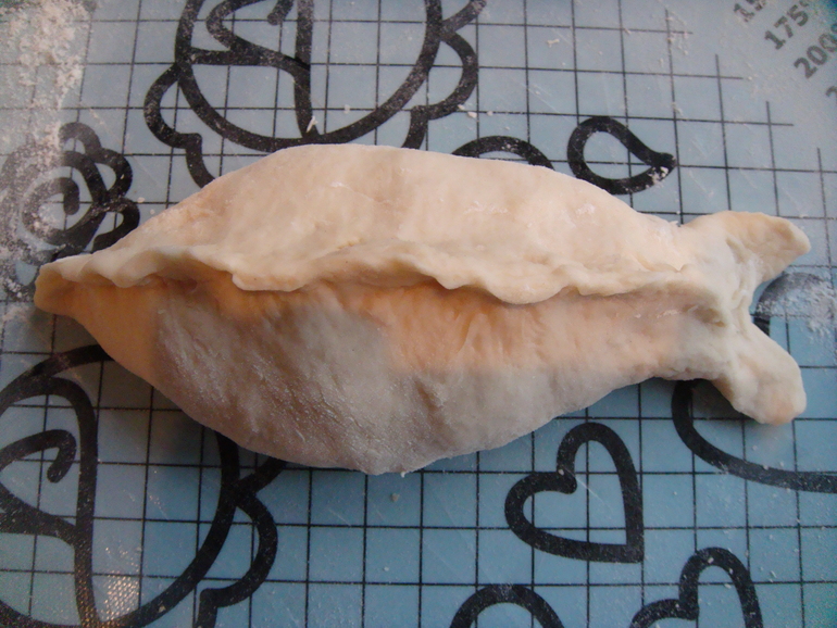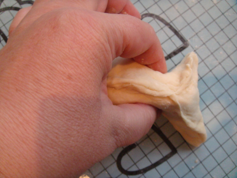 Сдавить руками кончик пирожка, сформировав хвостик: