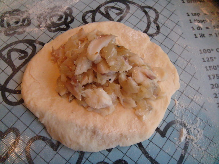 Размять руками в лепешку, выложить по 1 ст.л. начинки: