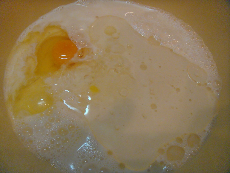 Для теста нагреть 1 стакан молока, влить 3 ст.л. растительного масла. Добавить 1 яйцо, 3 ст.л. сахара и щепотку соли: