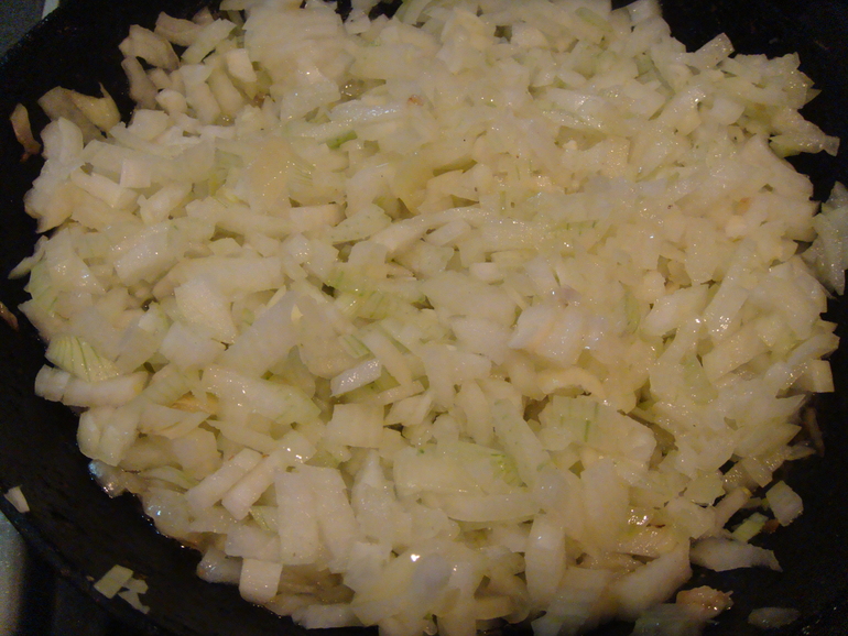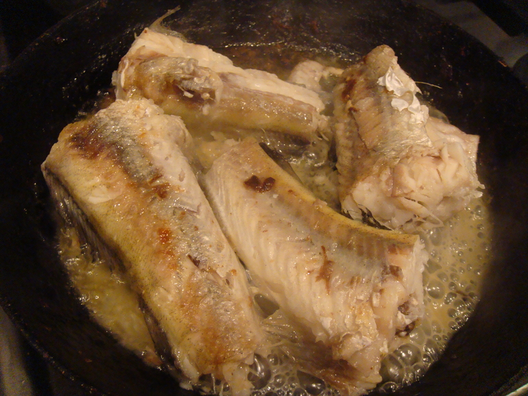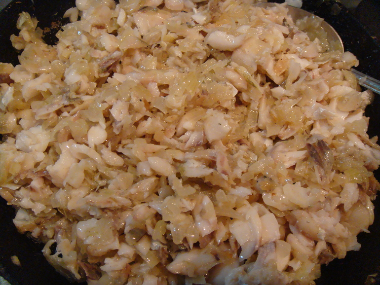 В это время займемся начинкой. Поджарить подсоленную рыбу (у меня минтай обыкновенный):