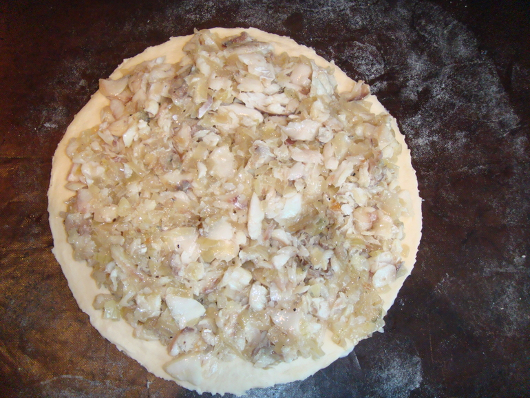 Подожедшее тесто разделить на несколько частей. 1 часть раскатать круглым пластом в 1 см, переложить на противень. Выложить половину начинки: