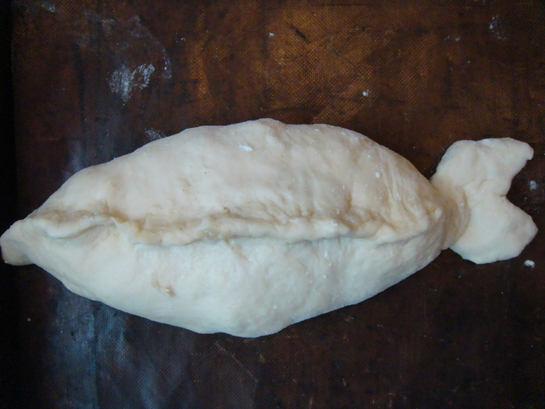 Формировать рыбок можно по-разному. 1 способ: слепить обычный пирожок швом вверх и прикрепить хвост: