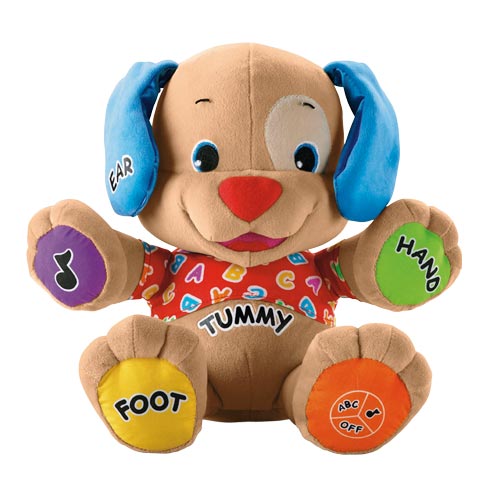 У нас на английском, так как приехал из Англии:) Я его ооочень хотела, и хорошо, что не купила - было бы два)) Прикольная игрушка! Два режима: обучение и песенки. На режиме обучения называет части тела и цвета, поет песенку про алфавит, цвета. Звук четкий, песенки хорошие. Единственный минус пока - щенок собирает всю пыль и ворс с коврика, по которому его активно сейчас елозят.