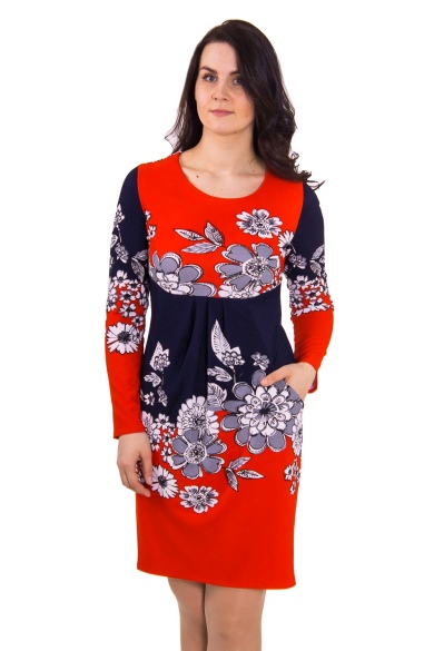 Платье полуприлегающего силуэта, отрезное под грудью. На нижней части переда складки заложены к центру, отрезные бочки и карманы. На лифе складки заложены от центра. Горловина обработана обтачкой. Рукав втачной, длинный.
