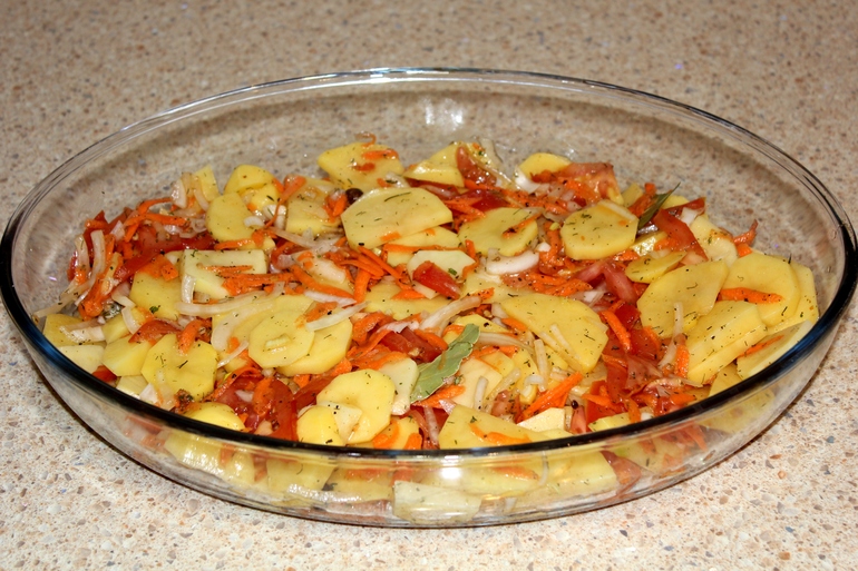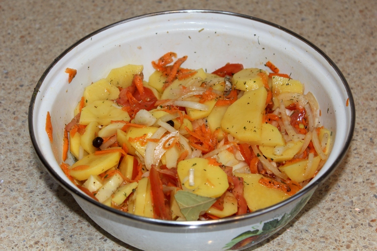 Картофель порезать пластинами, морковь натереть на крупной терке, лук порезать полукольцами, помидоры порезать соломкой, добавить черный перец горошком, соль по вкусу, пряную зелень, лавровый лист. Все перемешать