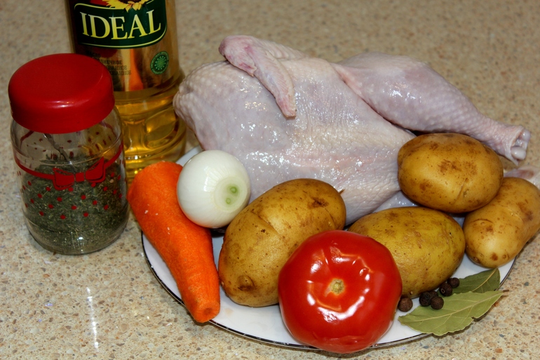 курочка, картофель, лук, морковь, помидоры, черный перец горошком, черный перец молотый, пряная зелень, соль, масло растительное
