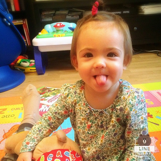 Болтает много на тарабарском. Из слов - "мама", "папа" сейчас почти не говорит почему-то (хотя любит его и вообще это было её первое слого-слово в 6 месяцев), а вот на дачу приехали, и она сразу "ба" бабушке, "деда" деду, "дядя". А папу называет, как бог на душу положит)) Озвучивает собаку (по-прежнему "га"), кошку ("мя"), курочку, гуся, петуха ("ку-ка-ку"), корову, совушку. Показывает в книжке всех перечисленных и других. Ну если не в настроении, или напоказ родне, то нипочём не покажет и не озвучит. "Разговаривает" по телефону много (хватает или мой телефон, или пульт от телевизора и ходит с очень деловым видом "дядядядяд"). Хотя я при ней немного разговариваю совсем, больше читаю с телефона. Танцует, как настоящая дочь рокера - трясёт хаером с диким видом :Р Или подпрыгивает на попе, или топает ногами и поднимает руки вверх.