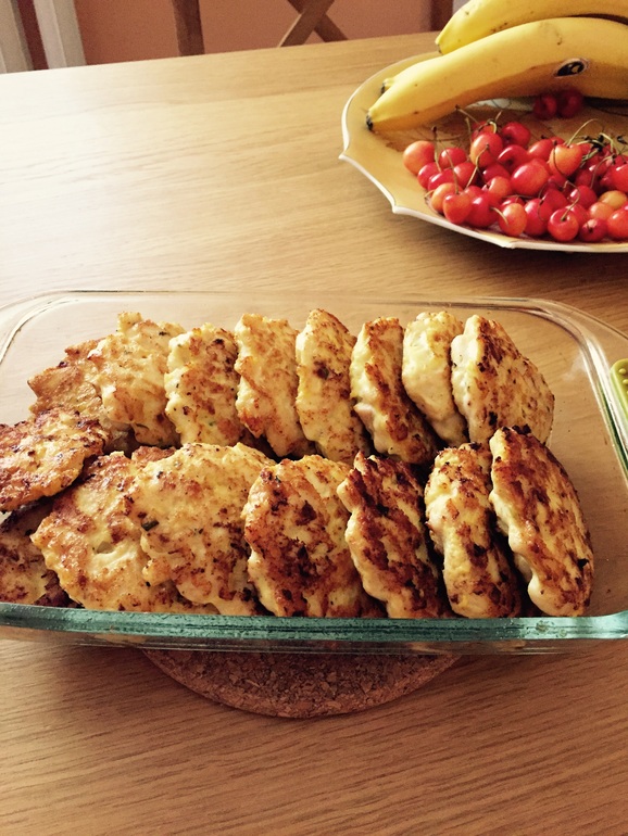 Филе куриной грудки(около 1кг) нарезать на мелкие кусочки+мелко нарубить крупную головку лука+ 2яйца+2-3ст ложки крахмала+2ст ложки сметаны(для себя,т.к я активно худею заменяю на натуральный йогурт)+соль,перец по вкусу+специи(кто какие любит, я кладу обычно чуть шафрана,чабрец и сушеный базилик). Все перемешать,дать немного постоять(минут20-30) и жарить на минимальном колич-ве масла(жарю на тефлоновой сковороде,чтобы использовать масла поменьше .