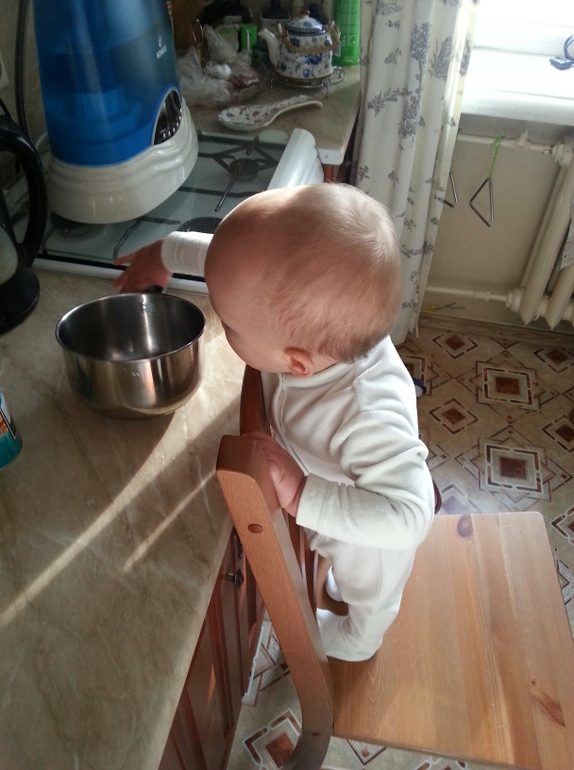 А ещё!!! Крошка всё увереннее есть ложкой! Причём, очень ему хочется поесть руками. Макает ложку в кашу и одним пальчиком невзначай касается каши))) Забавно очень!